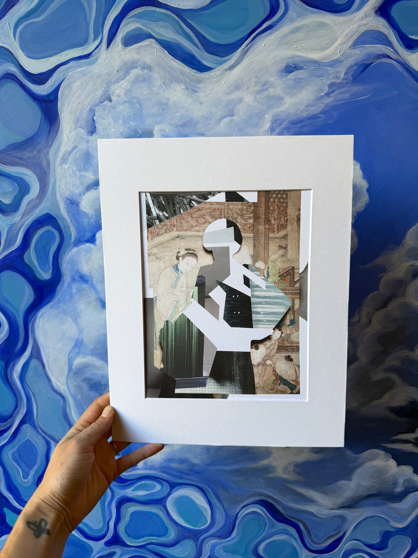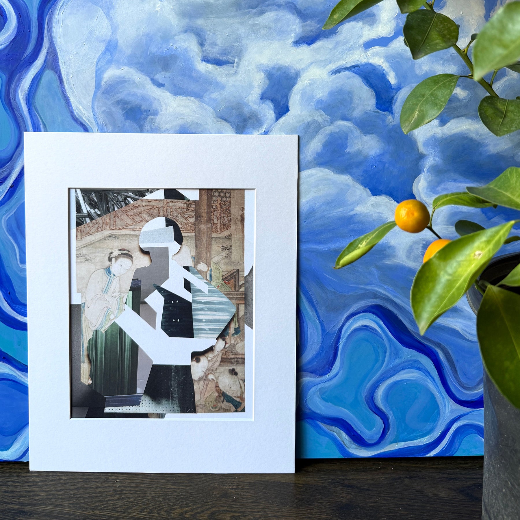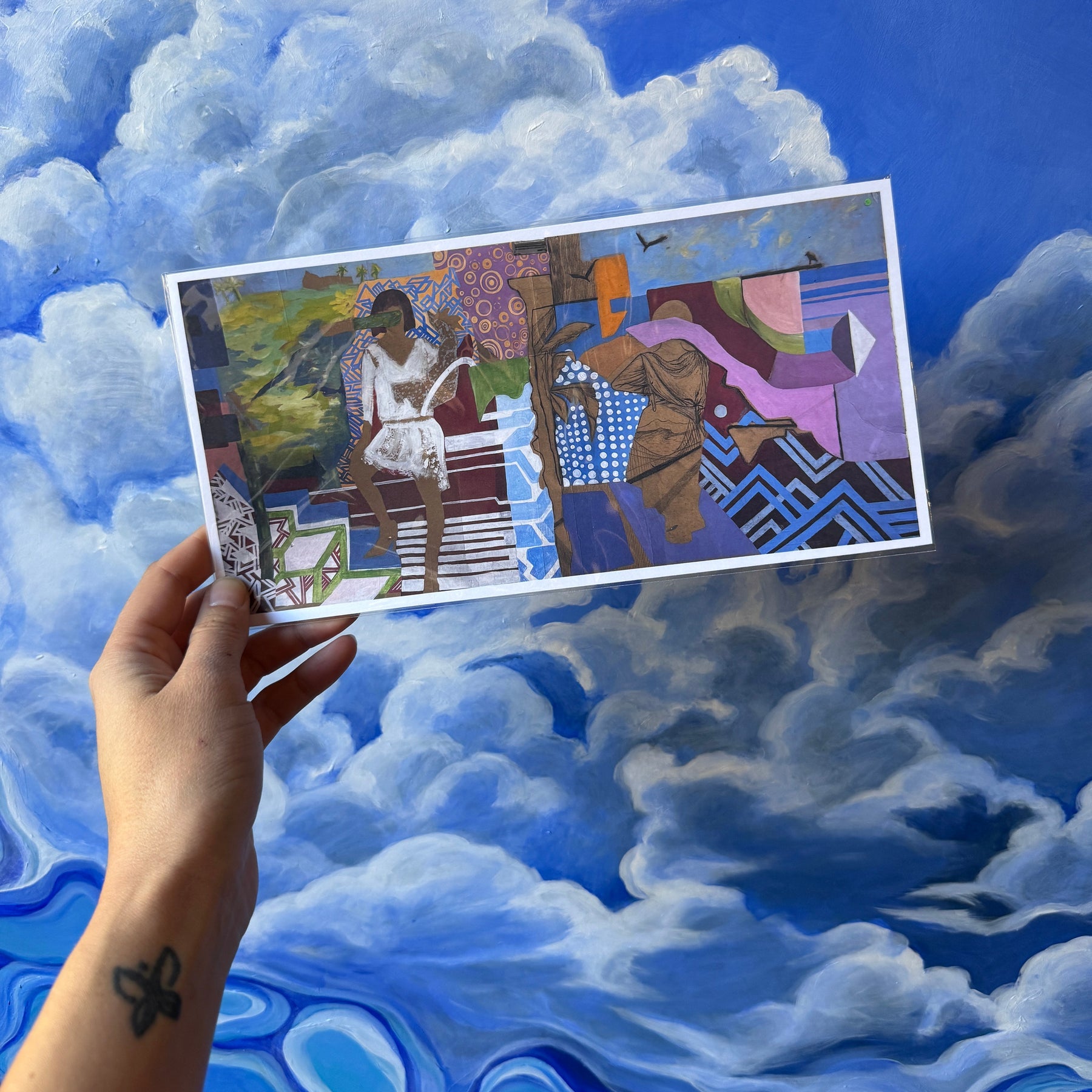The original piece is a photolithography print based on a collage, digitally layered over another photolithography print of clouds. Made in Buenos Aires in 2022.